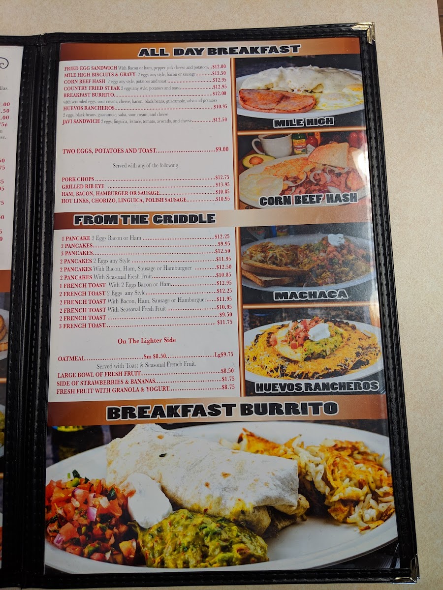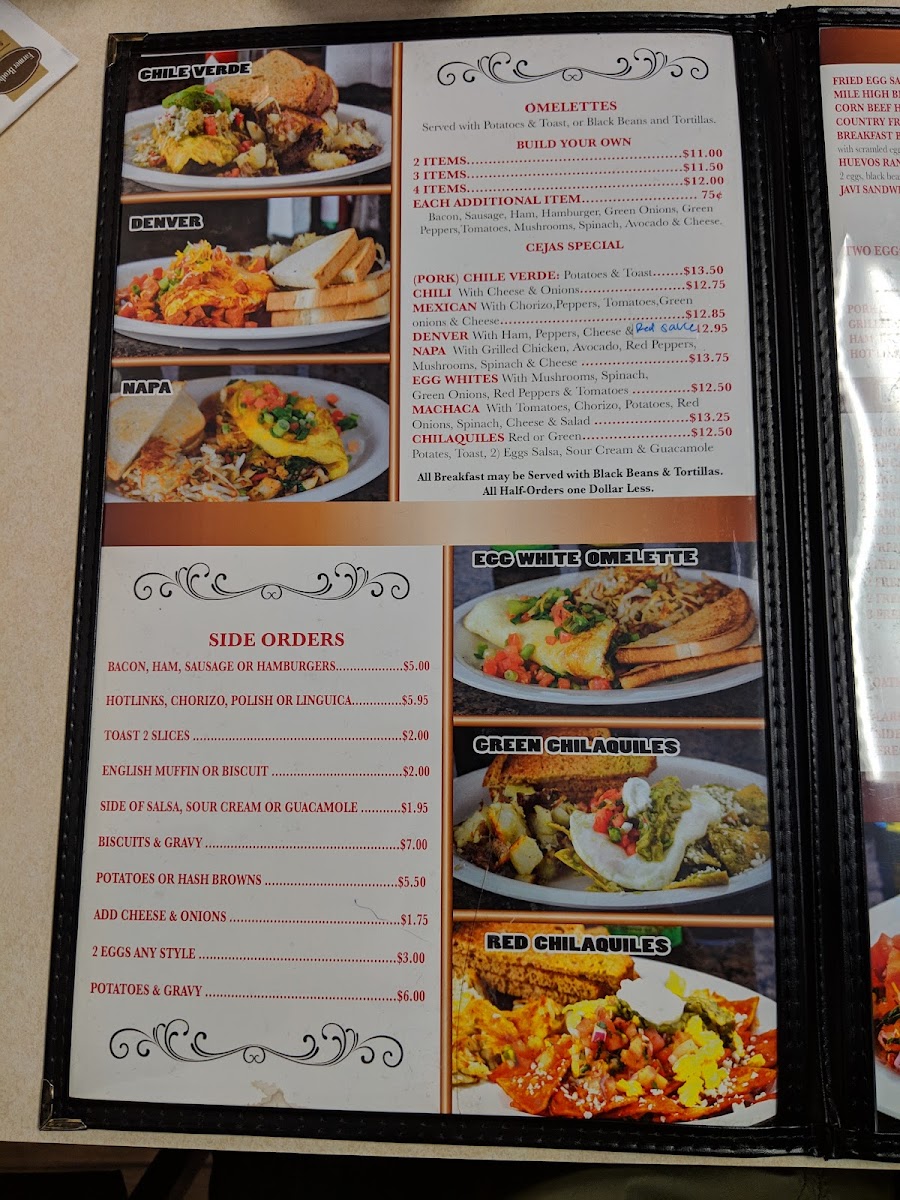 ### Special Omelettes **1/2 Denver Omelette** Omelette served with choice of toast and side. Toast options include various breads, tortillas, fruit, or no toast. Side includes potatoes, beans, fruits, vegetables, or other substitutes.